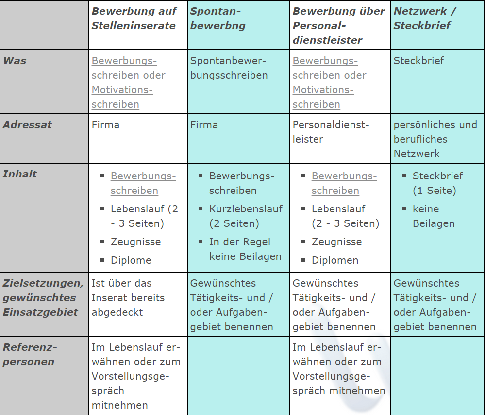 In der nachfolgenden Tabelle sind vier wichtige Bewerbungsstrategien aufgeführt. Sie können nun alle 4 anwenden, mit der Gefahr, dass Sie sich verzetteln und Ihre Kraft streuen, anstatt fokussiert vorzugehen.